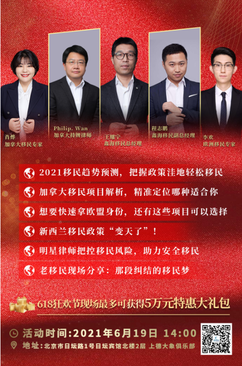 北京站“618全球移民身份布局盛宴”于2021年06月19日(周六),14:00,在北京市日坛路1号日坛宾馆北楼2层 上德大象俱乐部举办。鑫海移民总经理王耀宁先生携副总经理程志鹏先生、加拿大持牌律师Philip.Wan等人与大家一起品好茶、酌好酒、论移民之道;加拿大、新西兰、土耳其、希腊、葡萄牙五大移民黑马政策全解密。