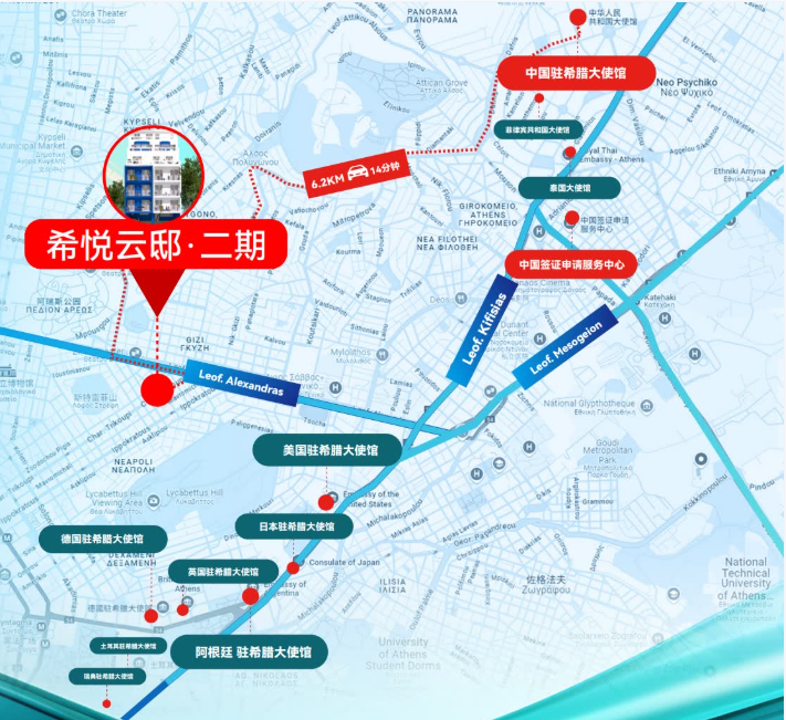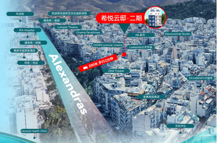 希悦云邸·二期距离希腊交通的黄金动脉--Alexan-dras大道仅200米,该大道贯穿南北,以璀璨之姿串联宪法广场的政经脉搏、国立花园的绿意文脉。它不仅是雅典的交通命脉,更是雅典政治、经济、文化的汇聚之所,让居住在此的人们尽享城市中心的繁华与便捷,项目位居欧洲海陆黄金节点,驱驰18分钟直抵欧陆十大名港比雷埃夫斯,坐拥“一带一路”海陆双脉交汇的财富场域。世界级物流大通道与城市立体路网在此无缝交融。近享地铁1号线Biktória站,亦能迅捷通达雅典国际机场。全球效率与恒久价值,在此处从容交汇。